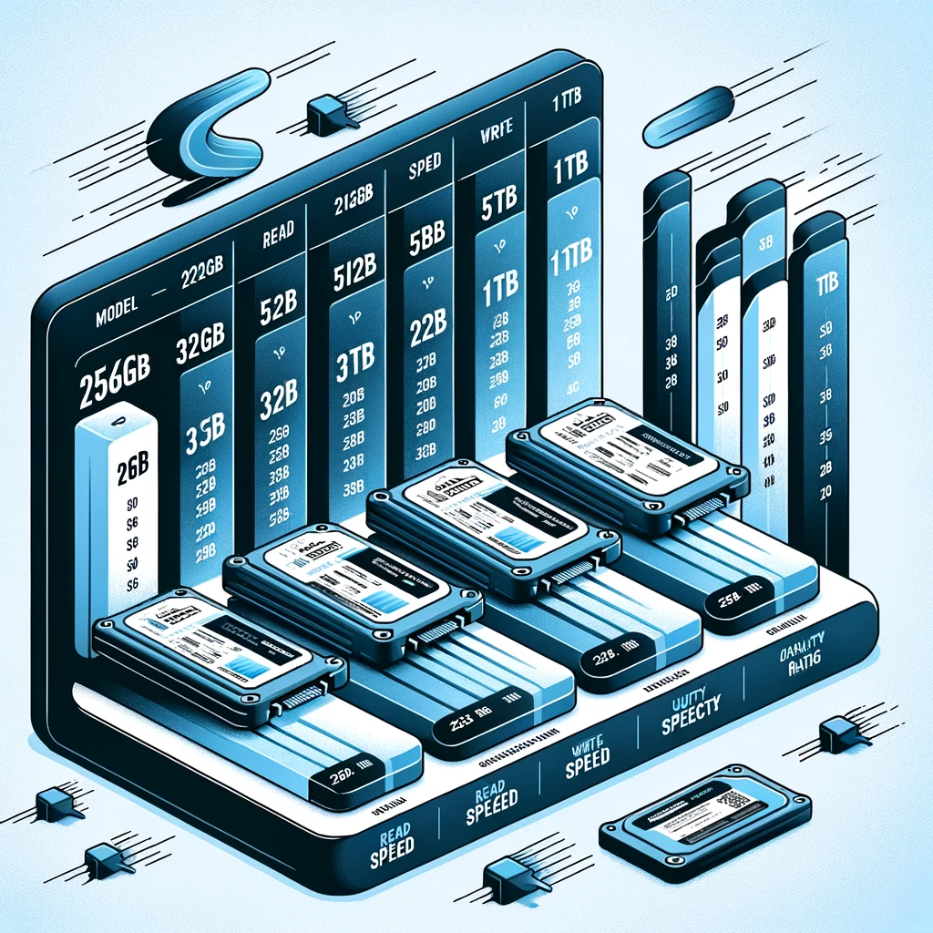 이 인포그래픽은 다양한 SSD의 성능을 비교하는 표를 포함하고 있습니다. 각 SSD 모델의 저장 용량, 읽기 속도, 쓰기 속도, 그리고 내구성 등급이 표에 나타나 있어 사용자가 SSD의 성능 특성을 기반으로 비교하는 데 도움을 줍니다. 이 표는 SSD를 선택할 때 중요한 성능 지표를 쉽게 이해하고 비교할 수 있도록 설계되었습니다.